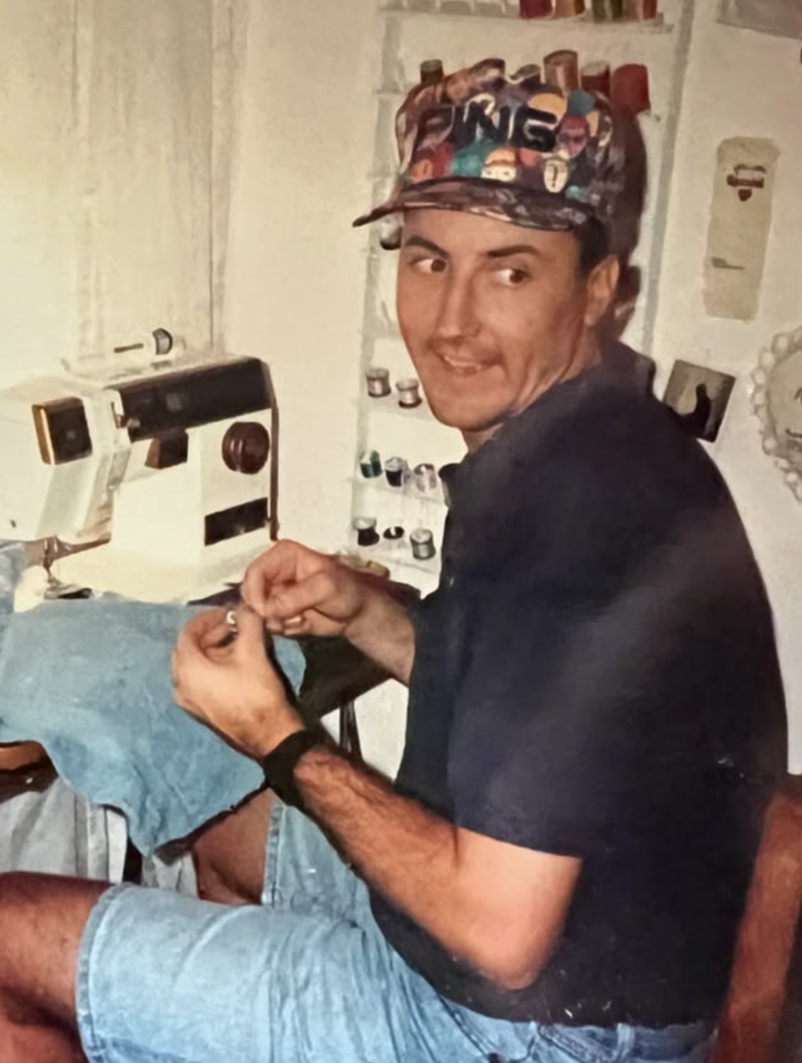 Photo of my dad in the pink room using my grandmother’s sewing machine.